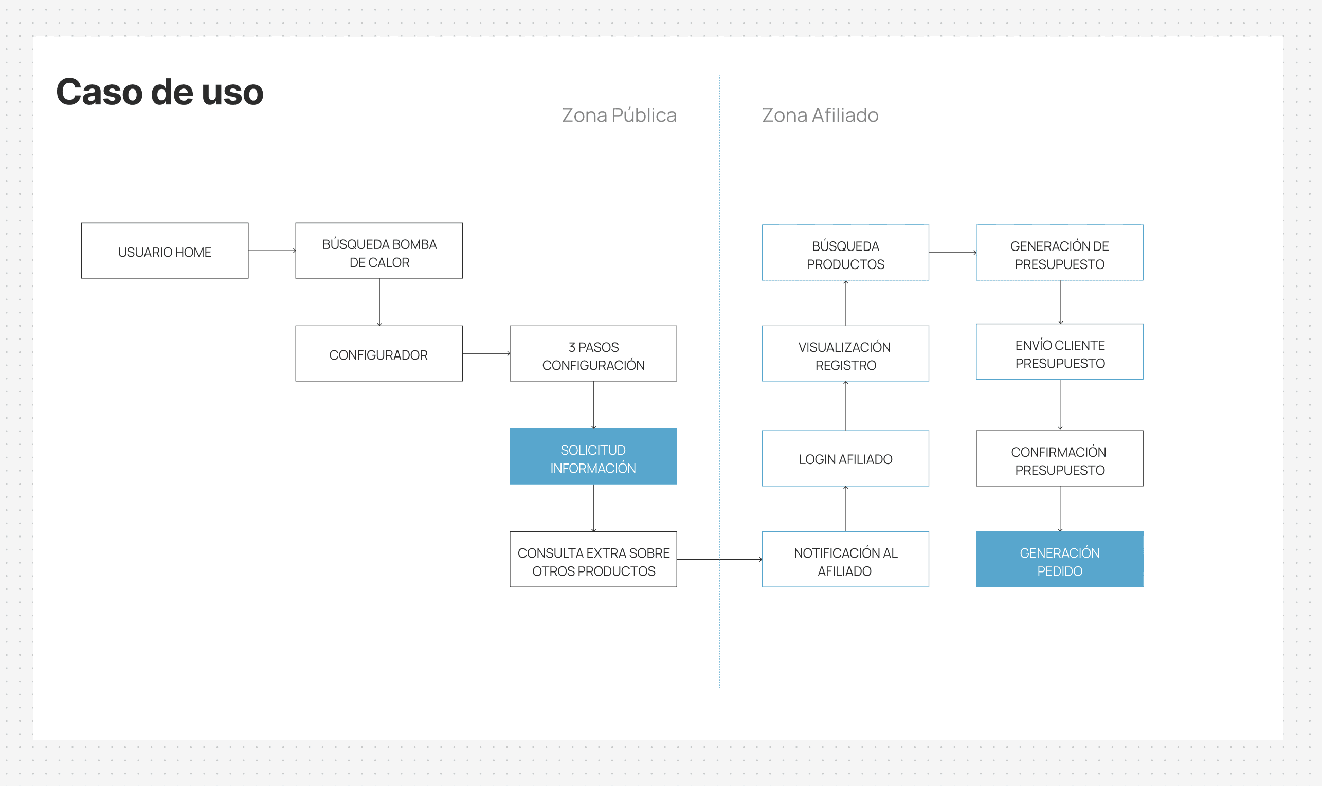 Este caso de uso corresponde al flujo de un usuario que busca adquirir un producto configurable y solicita un presupuesto al afiliado más cercano según su ubicación.