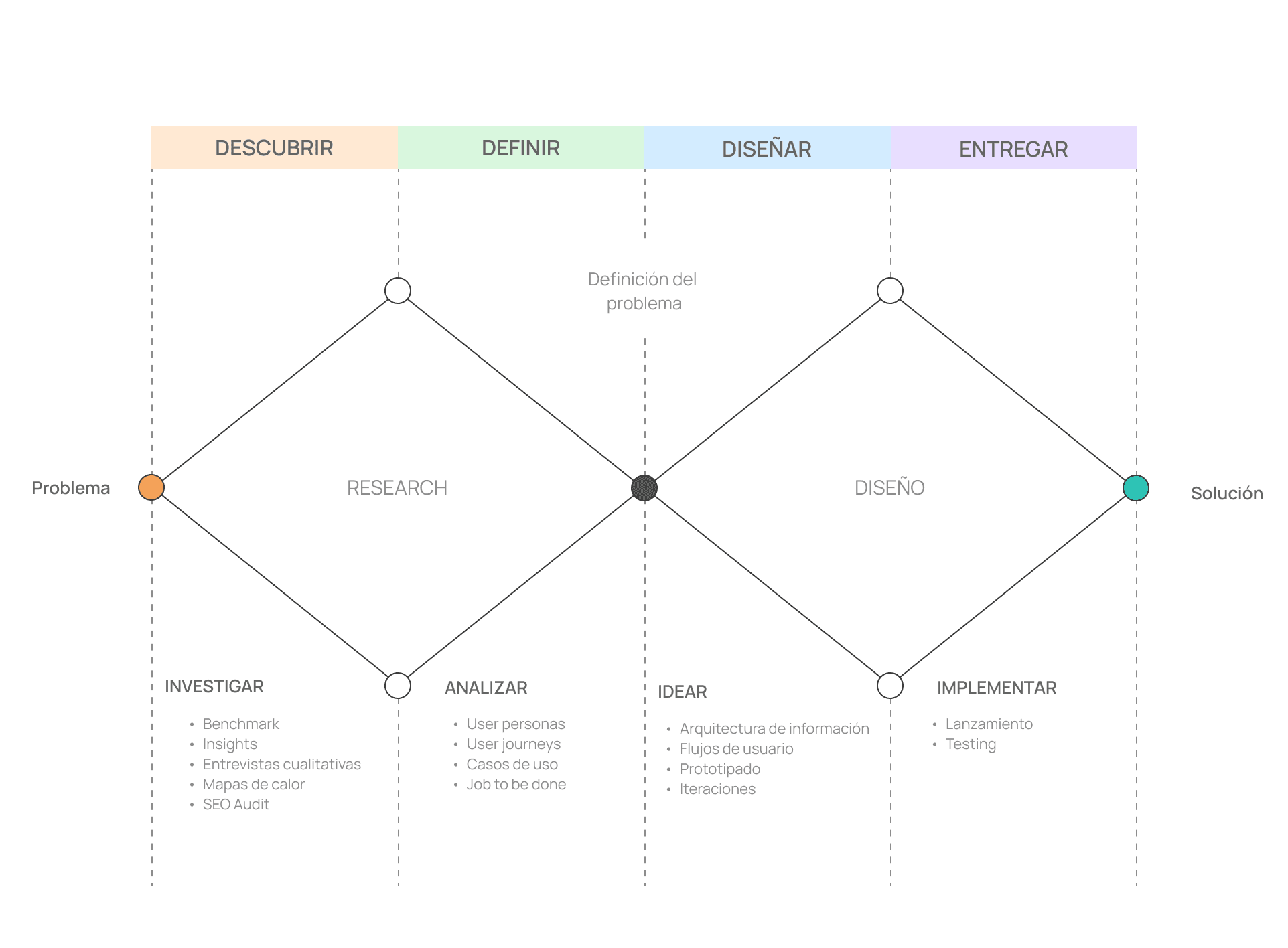 El proceso de diseño sigue una metodología estructurada que permite explorar problemas y encontrar soluciones efectivas. En este proyecto, nos basamos en el Doble Diamante, un enfoque desarrollado por el Design Council en 2005, que organiza el diseño en cuatro fases clave:
