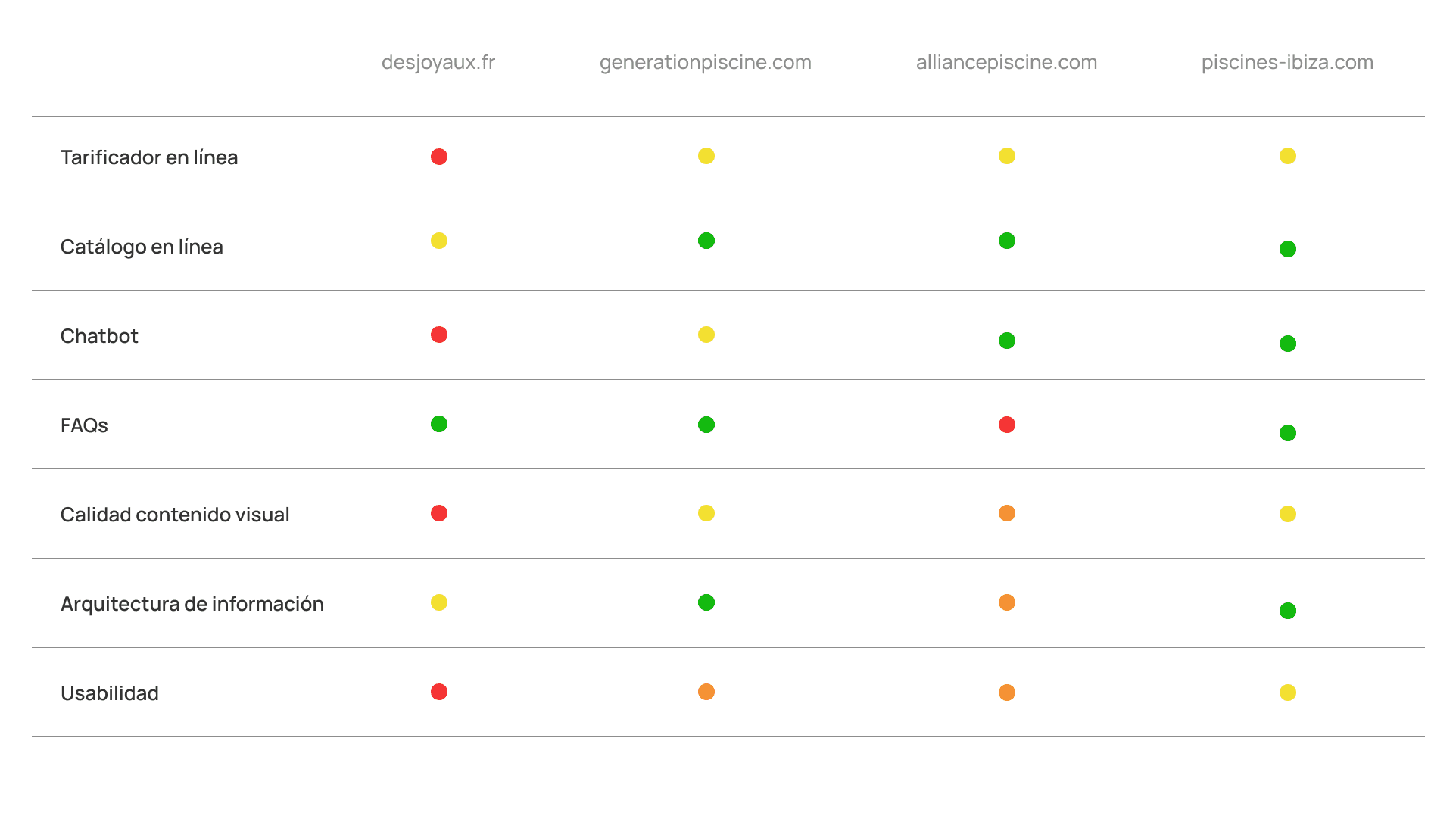 Analizamos la presencia digital de los principales competidores de PDU para identificar oportunidades estratégicas. Piscines Ibiza destaca por su estructura clara, buena usabilidad y la integración de FAQs y chatbot, ofreciendo una experiencia más completa.
